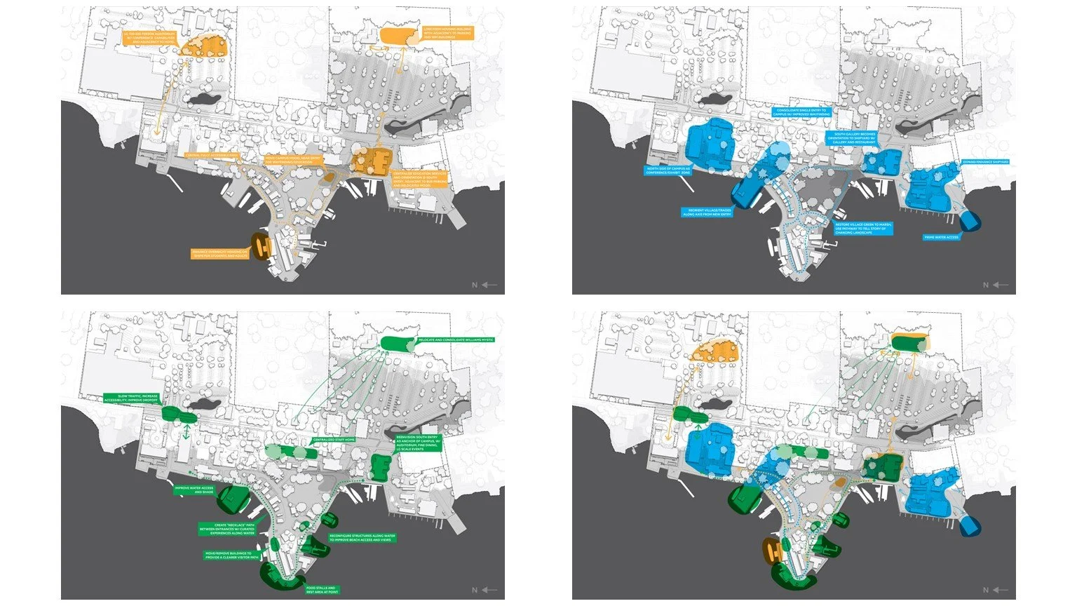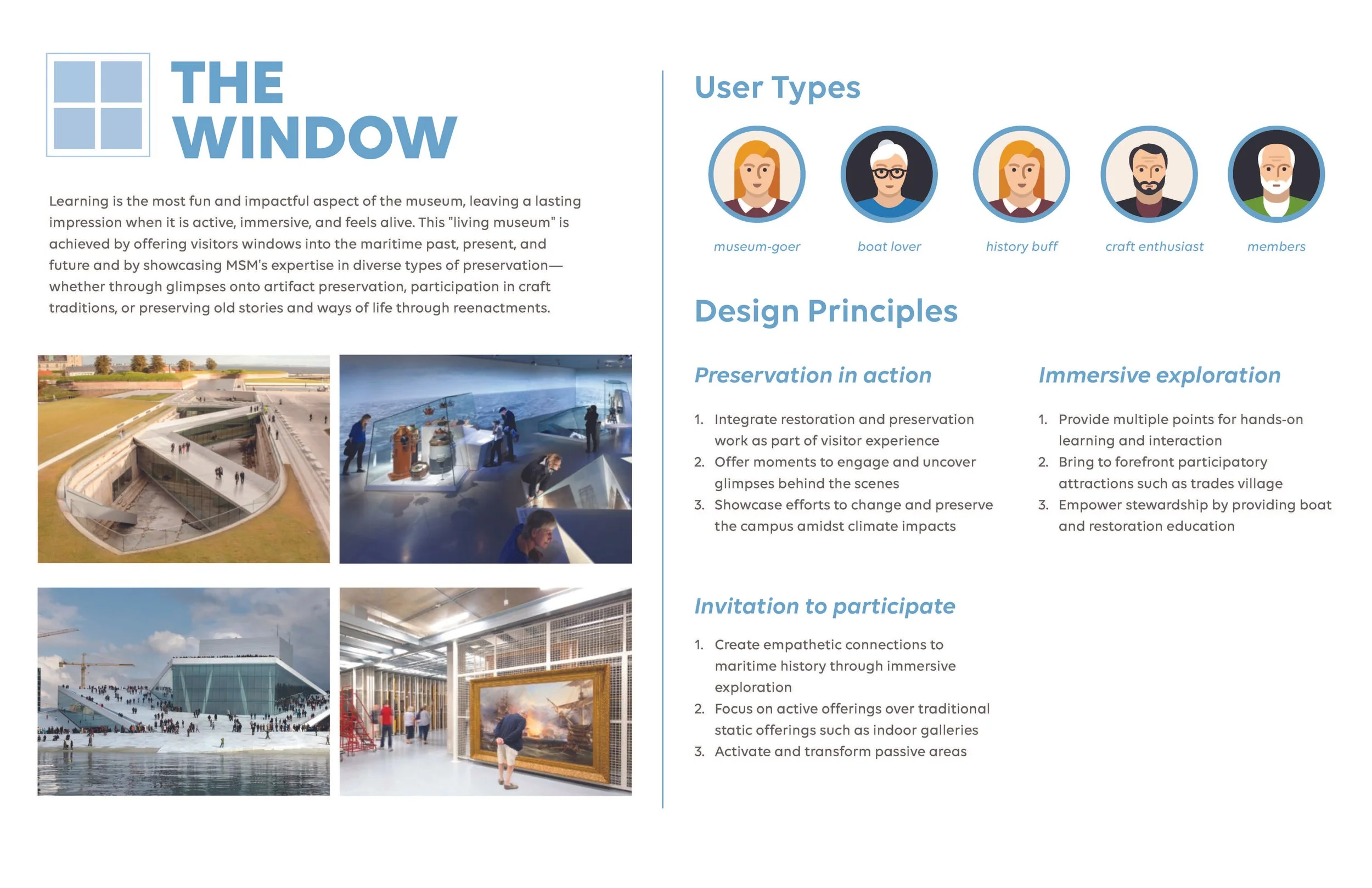 Vision 1, The Window, focused on immersive, learning experiences for visitors and showcased the Museum’s expertise in historic restoration beyond its curated collections. Vision 2, The Seaside Village, catered to those who like to gather, celebrate, or relax in a beautiful historic atmosphere, albeit without directly experiencing the Museum’s collections. Vision 3, The Maritime University, prioritized hosting academic researchers and conventions that leverage the Museum’s prominence in New England and maritime histories.